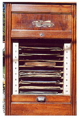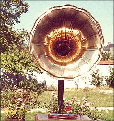L'appareil qui sert de menu à cette partie du musée est un Concert Automatique Français, un appareil destiné aux lieux publics. Celui-ci date des années 1920. Sur la décalcomanie, reproduite ci-contre, on peut lire l'adresse du constructeur: "Le Concert Automatique français / 71, rue des Tribunes / Versailles-Porchefontaine". Le meuble en lui-même est un simple classeur à rideau servant à ranger les disques sur des rayons numérotés. La partie supérieure abrite le mécanisme à monnayeur. Le grand pavillon en laiton est la partie la plus spectaculaire de l'appareil. Un tel appareil coûtait à l'époque une somme rondelette: 1800 F (l'équivalent de 5000 F actuels) selon une facture trouvée dans un appareil analogue vendu en 1927. Son automatisme était assez relatif car il demandait tout de même de la part de l'utilisateur un certain nombre de manipulations: