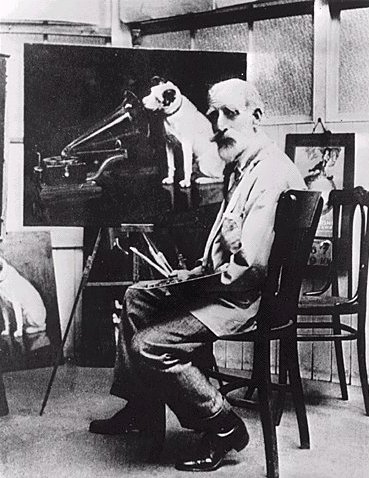 En 1899, Francis Barraud, qui était un peintre de talent ou tout au moins un bon professionnel de la peinture, imagina de peindre un tableau représentant un chien écoutant un phonographe. Il se souvint qu'il possédait une photo de Nipper, disparu quelques années avant. Barraud racontait qu'il se souvenait de l'étonnement de Nipper quand il faisait marcher son phonographe à cylindres. La première version de l'oeuvre représente donc le chien devant un phonographe Edison Bell à cylindres. Il intitula sa toile de façon ô combien appropriée: "His Master's Voice" ! Mais le pavillon noir peu esthétique ne plaisait pas à Barraud qui chercha à se procurer un modèle de pavillon plus décoratif pour agrémenter son oeuvre. Il se rendit donc, avec une photo de son tableau à la Gramophone Company pour essayer d'emprunter un pavillon plus esthétique ( Barraud ne peignait jamais sans modèle). Lorsqu'il vit la photo du tableau, Barry Owen directeur de la compagnie demanda au peintre si sa toile était à vendre et s'il pouvait remplacer le phono à cylindres par un appareil de leur fabrication. Francis Barraud accepta la proposition et se fit prêter un Gramophone à pavillon de laiton pour modifier son tableau.